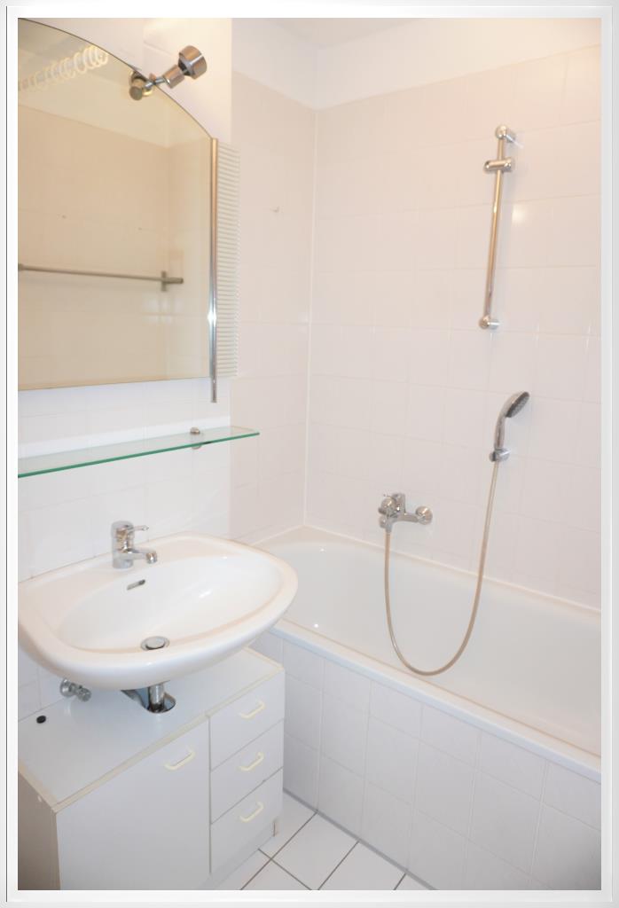Das Bad ist hell gefliest und mit einer Badewanne ausgestattet.