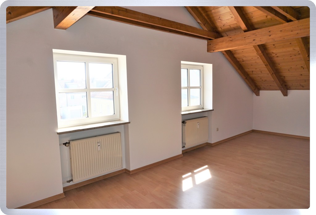 In dieser Wohnung befindet sich ein geräumiger Wohnbereich mit Sichtdachstuhl.