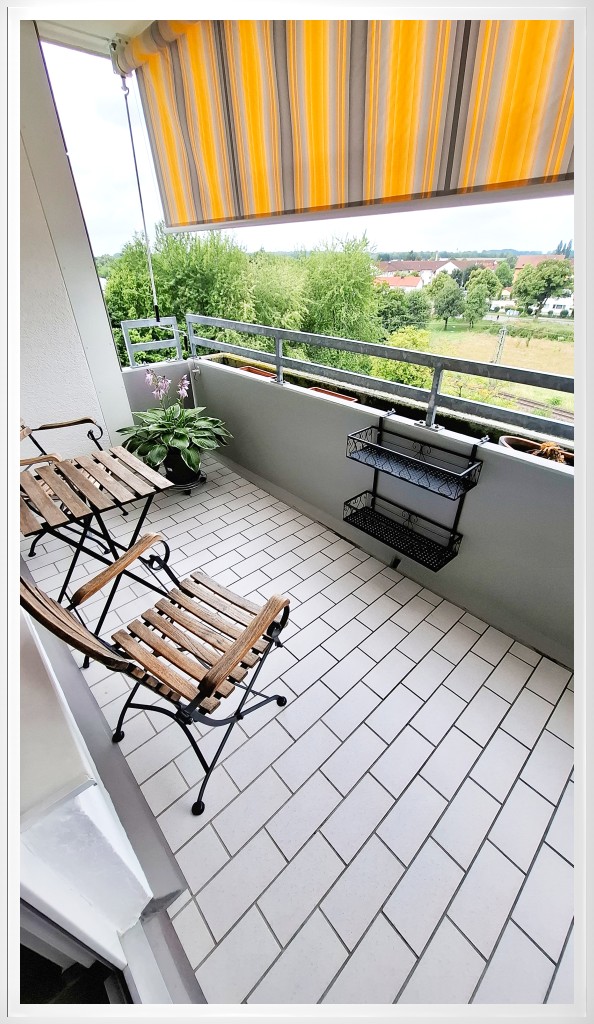 Der große Wohnbereich mit ist gut geschnitten und hat Zugang zu dem großen sonnigen Westbalkon mit Markise.