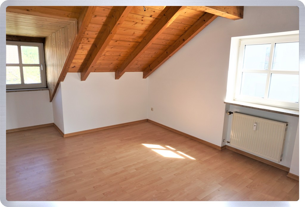 In dieser Wohnung befindet sich ein geräumiger Wohnbereich mit Sichtdachstuhl.