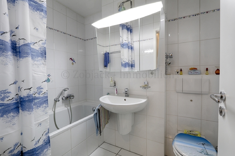 + hell gefliestes Bad mit Badewanne und Handtuchheizkörper