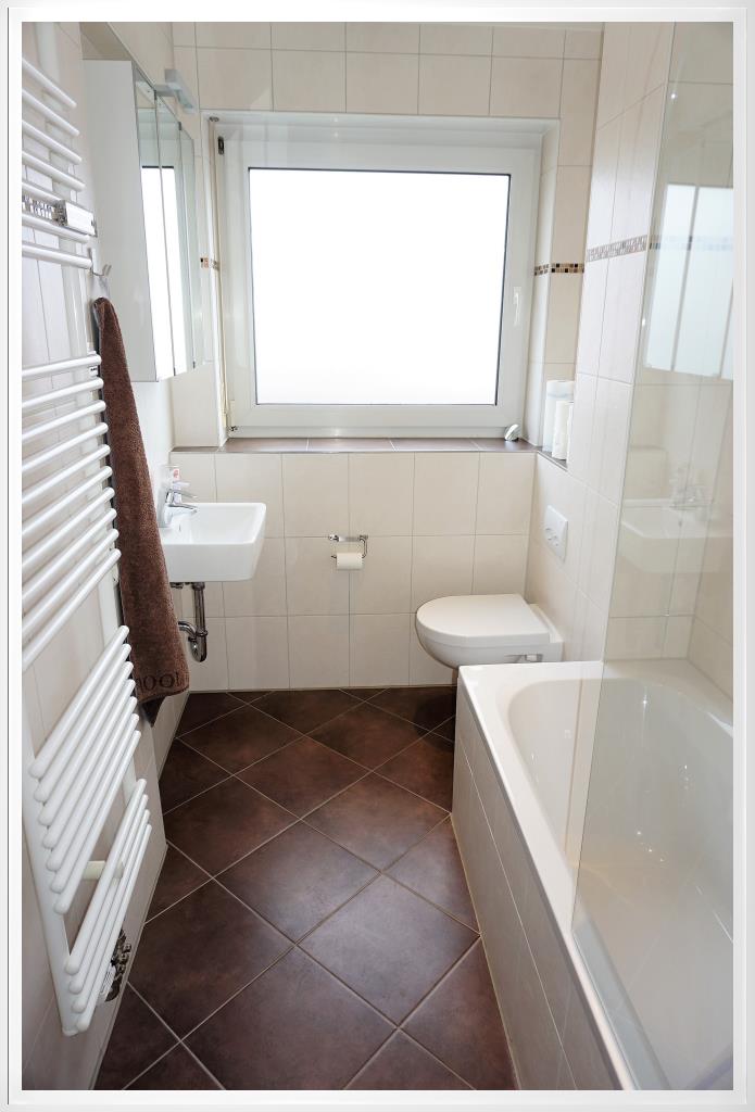Das Bad ist mit einer Wanne, WC und einem Fenster ausgestattet.