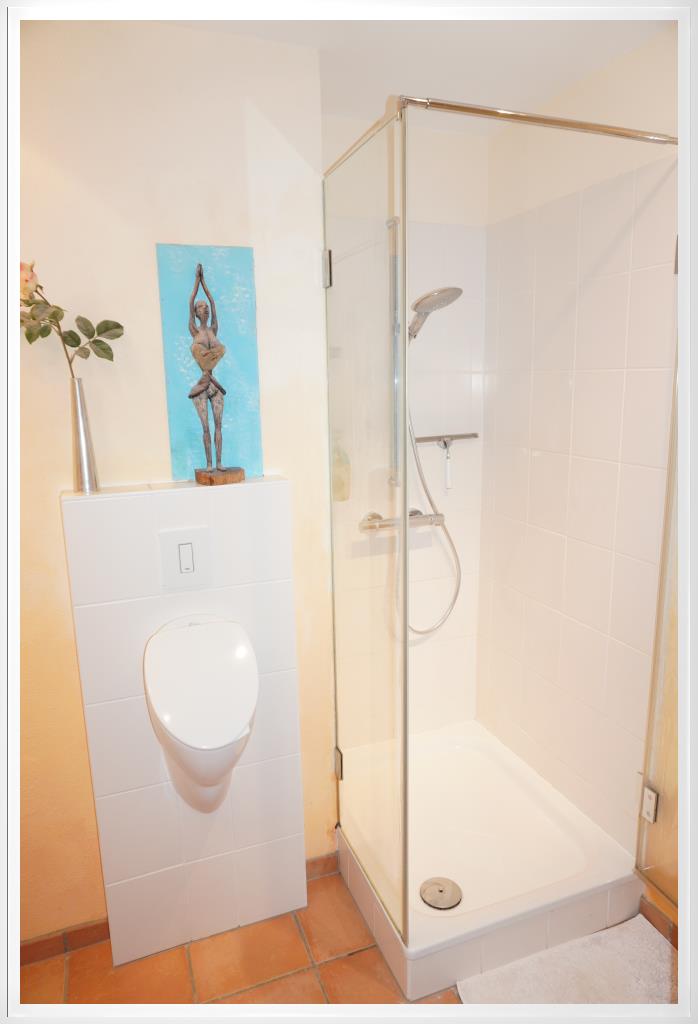 Ein schönes modern gefliestes Badezimmer mit Dusche und Waschmaschinenanschluss ist auch vorhanden. Das WC ist separat.