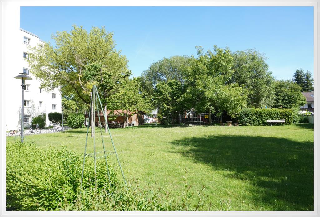 Der Garten ist ein Gemeinschaftsgarten mit Spielplatz, Tischtennisplatte und Sitzgelegenheiten.