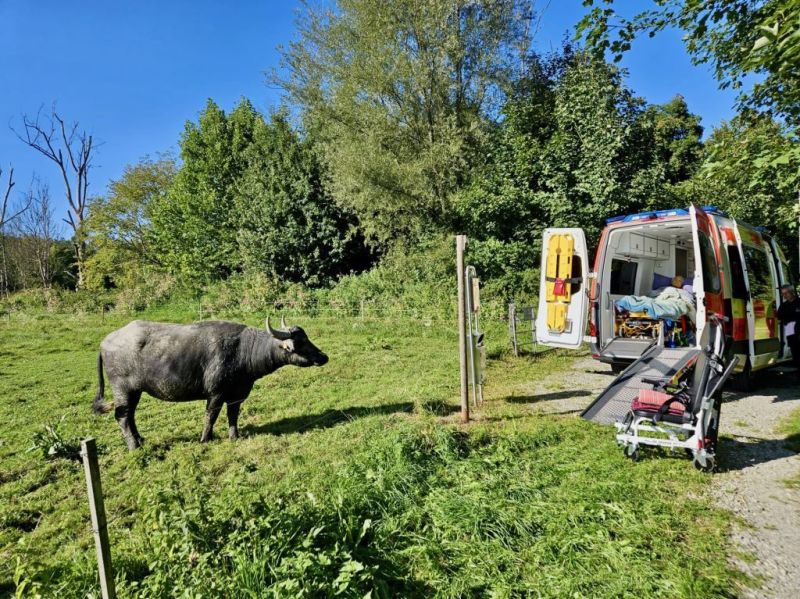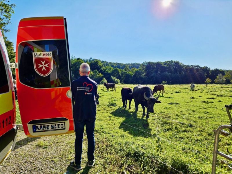 Bild 3: Mit dem Krankenwagen den Weidezaun zu den Wasserbüffeln. Das Malteser Herzenswunsch-Team macht es möglich.