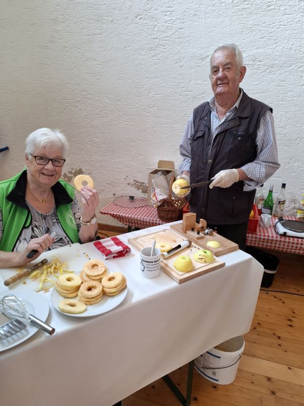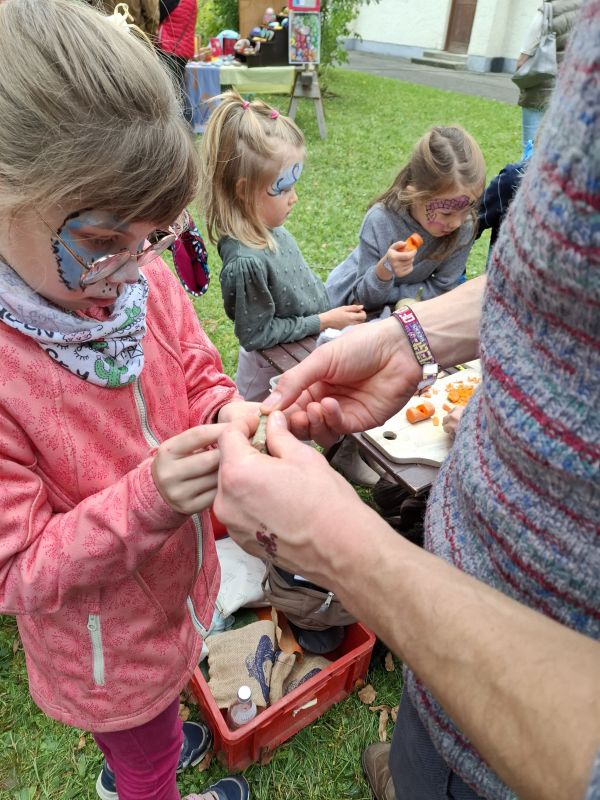 Am Nachmittag kam dann, entgegen der Vorhersage noch die Sonne vorbei, so dass das Zuhören bei der Hexe, die Geschichten erzählte, und das Besuchen der vielen Stände noch angenehmer wurde. Von Kürbissen über Honig und Informationen, z. B. vom Verein „Tatendrang“, war alles dabei. Sehr eindrucksvoll war, wie Josef Schwaiger mit den Kindern aus Karotten Pfeiferl schnitzte.