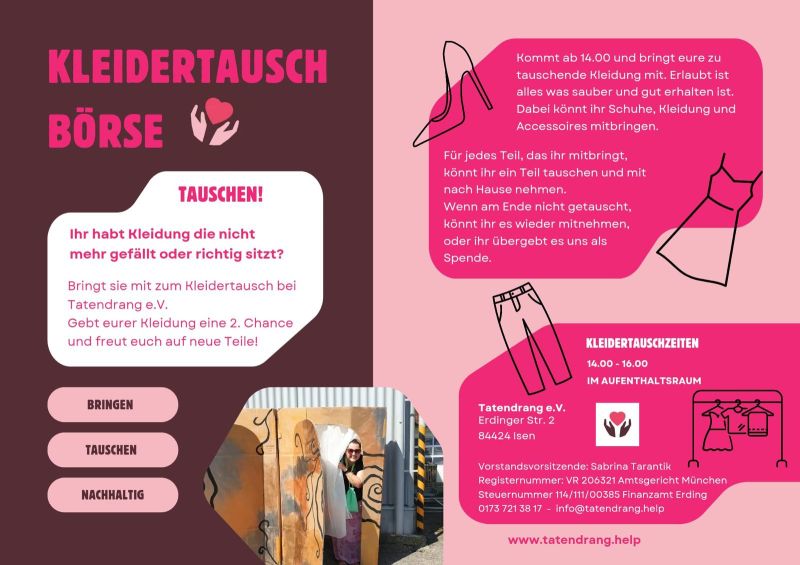 Ab 14:00 Uhr findet eine Kleidertauschbörse statt – bringen Sie Ihre gut erhaltenen gereinigten Kleidungsstücke, Schuhe und Accessoires mit und tauschen diese gegen die vorhandenen Artikel. Was nicht getauscht wird, können Sie wieder mitnehmen oder aber uns als Spende überlassen.