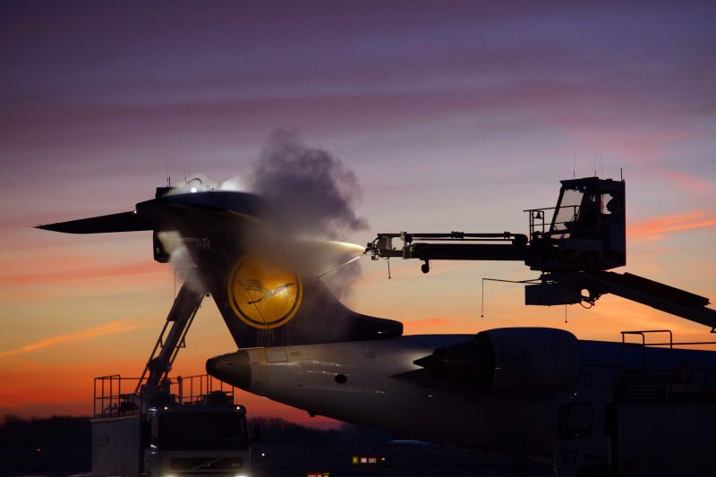 Aber nicht nur die Verkehrsflächen des Airports müssen in der kalten Jahreszeit in einem betriebssicheren Zustand gehalten werden: Auch die Flugzeuge müssen vor dem Start von Schnee und Eis befreit werden.