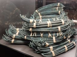 Exakt in Zehner-Bündeln niedergelegt: Der Kupferschatz aus Oberding. Foto: Museum Erding.
