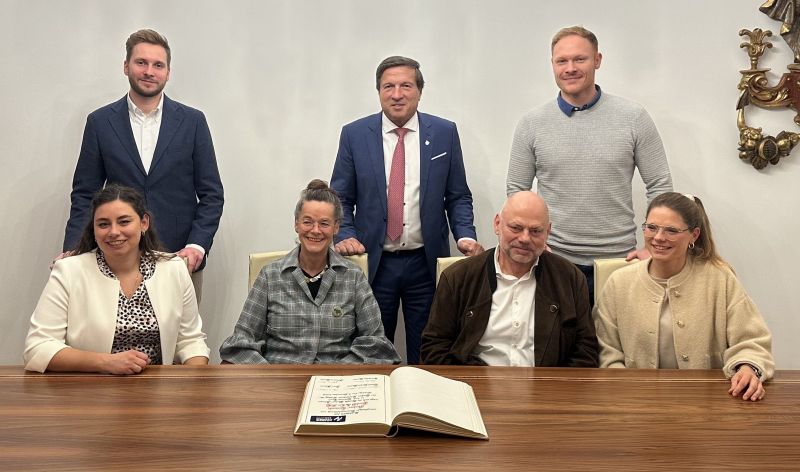 Aus Anlass des 100-jährigen Bestehens der Firma Huber Technik GmbH haben sich jetzt die Firmeninhaber Paul Kamm (sitzend, 2.v.re) und Heidi Huber-Kamm (2.v.li.) sowie ihre Töchter Johanna (links) und Veronika ins Goldene Buch der Stadt Erding eingetragen.