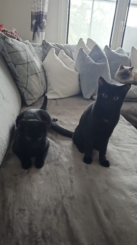 Das pechschwarze Duo versteht sich wunderbar mit anderen Katzen und kommt auch mit dem Hund in ihrer Pflegestelle bestens zurecht.