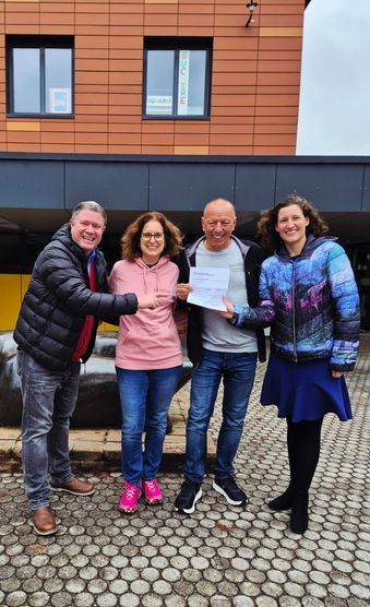 Quelle: Förderverein - v.l. Thomas Speyerer (stellv. Vorsitzender Förderverein), Rebecca Günther und Heiko Günther (Malerbetrieb) sowie Margit Griesbacher (Schriftführerin Förderverein) bei der Spendenübergabe