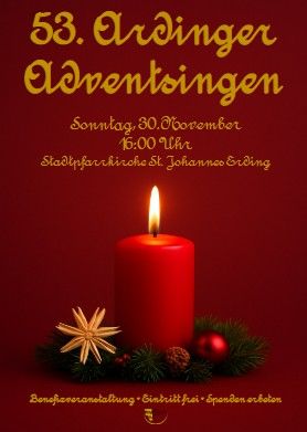 Der Pfarrcaecilienverein Erding e.V. lädt ein zum 53. Ardinger Adventssingen am 1. Adventsonntag um 16 Uhr in der Stadtpfarrkirche St. Johannes Erding.