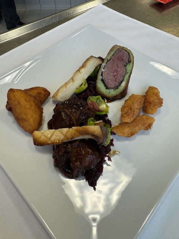Zwei Tage später präsentierten die angehenden Köchinnen und Köche schließlich das Ergebnis ihrer Arbeit: ein hochwertiges Feldhasen-Menü aus Vorspeise, Suppe und Hauptgang, zubereitet aus selbst verarbeitetem, regionalem Wild.