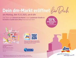 Am Montag, 15. Dezember, eröffnet der neue dm-Markt in der Landshuter Straße 43 in Taufkirchen (Vils).