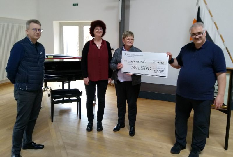 Beim anschließenden gemütlichen Beisammensein im Pfarrsaal überreichte das Leitungsteam der Kolpingsfamilie Klettham mit Claudia Deimer (2.v.l) , Meinhard Karner (l) und Wolfgang Reiter (r) einen Scheck in Höhe von 1.000 Euro an die Tafel Erding, vertreten durch die Stadt- und Kreisrätin Petra Bauernfeind (2.v.l).