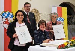 Bei der Unterzeichnung des Goldenen Buches des Landkreises Erding v.l. Sosa Balderanou (therapeutisches Reiten), Landrat Martin Bayerstorfer, Staatsministerin a.D. Christa Stewens, Marlene Hohlbach