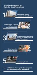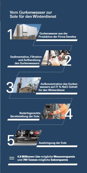 organischen Rückstände enthält, die eine Verwendung im Winterdienst ausschließen würden. Die bisherigen Einsätze in den Straßenmeistereien des Staatlichen Bauamtes Landshut zeigen, dass die Sole aus Gurkenwasser genauso effektiv und sicher ist wie herkömmliche Sole. Durch die Verwendung der Gurkengärlake als Ausgangsstoff für die Winterdienstsole kann durch die damit verbundene Einsparung an Trinkwasser und Salz die Umwelt nachhaltig entlastet und geschützt werden.