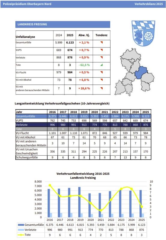 In den Landkreisen des Zuständigkeitsbereiches des Polizeipräsidiums Oberbayern Nord stieg die Gesamtzahl der Verkehrsunfälle im vergangenen Jahr 2025 um knapp über zwei Prozent an.