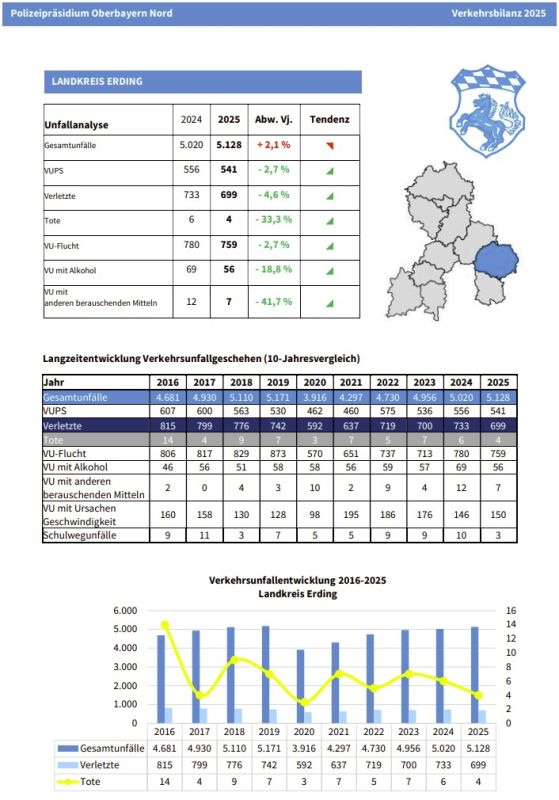 Entgegen des bayernweiten Trends weniger Verkehrstote und weniger Verletzte bei leicht steigenden Verkehrsunfallzahlen im Norden Oberbayerns