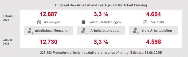 Arbeitslosigkeit: Im Landkreis Freising waren im Februar 2026 insgesamt 4.062 Personen arbeitslos gemeldet. Das waren 67 Frauen und Männer weniger als im ersten Monat des Jahres. Die Arbeitslosenquote veränderte sich nicht. Wie schon im Vormonat und im Vorjahr errechnete sich im Februar 2026 für den Landkreis eine Quote von 3,5 Prozent.