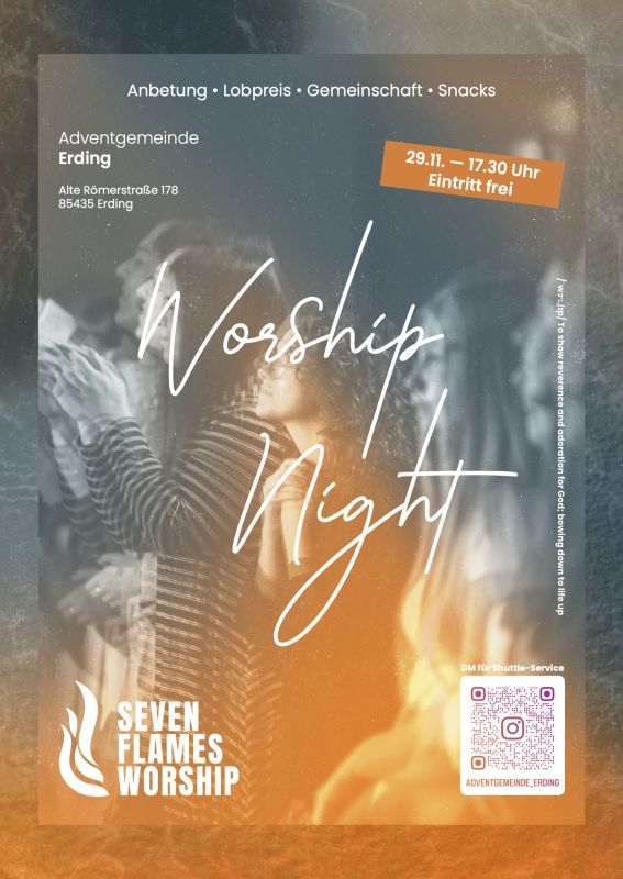 Wir laden euch herzlich zur Worship Night in der Adventgemeinde Erding ein. Diese findet am 29. November ab 17:30 Uhr statt. Wir wollen damit besonders die Jugendlichen in Erding erreichen.